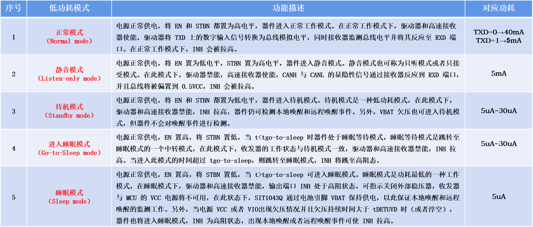 在下圖7中,我們選用SIT1043Q CAN收發(fā)器來進行系統(tǒng)功耗控制管理。當車門ECU節(jié)點在一定時間內(nèi)沒有傳感器故障告警,外部開關(guān)量也沒有輸入且CAN總線為空閑狀態(tài)時,MCU可控制SIT1043Q的EN=H;STB=L;使能SIT1043Q進入睡眠模式,SIT1043Q進入睡眠模式時,內(nèi)部模式控制電路將SIT1043Q自動切換到由VBAT 供電。當SIT1043Q進入睡眠模式后,SIT1043Q的INH引腳默認為高阻態(tài),此時通過外部電路的下拉電阻使能LDO的EN=L,從而關(guān)斷LDO的+5V電源輸出,系統(tǒng)進一步關(guān)閉MCU供電,使車門ECU節(jié)點系統(tǒng)功耗達到最低。當車門ECU節(jié)點有傳感器故障有告警,或外部開關(guān)量有輸入或CAN總線有數(shù)據(jù)通信時,SIT1043Q CAN芯片被喚醒,同時SIT1043Q的INH引腳輸出高電平,使能LDO的EN=1,這時開啟系統(tǒng)+5V給MCU與SIT1043Q正常上電。MCU正常上電初始化后,可根據(jù)系統(tǒng)數(shù)據(jù)采集判斷處理,來控制SIT1043Q的各種工作模式。通過這種系統(tǒng)節(jié)電模式管理,實現(xiàn)系統(tǒng)無工作時只有CAN通信與開關(guān)中斷部分電路低功耗監(jiān)聽,其它電路電源全部關(guān)閉,從而實現(xiàn)大大降低系統(tǒng)功耗,減少電池能量損耗。在系統(tǒng)MCU正常運行時,MCU可通過SIT1043Q此時對應(yīng)引腳輸出電平與執(zhí)行的操作(具體參考圖5),獲取當前工作狀態(tài)標志位,確定CAN網(wǎng)絡(luò)的工作狀態(tài),記錄并鎖定CAN節(jié)點的故障原因,便于系統(tǒng)故障診斷分析。