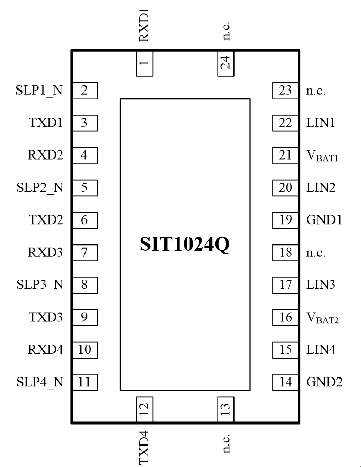 SIT1024Q是一款四通道本地互聯(lián)網(wǎng)絡(luò)(LIN)物理層收發(fā)器,符合LIN 2.0、LIN 2.1、LIN 2.2、LIN 2.2A、ISO 17987-4:2016 (12V) 和SAE J2602標(biāo)準(zhǔn)。主要適用于使用1kbps至20kbps傳輸速率的車(chē)載網(wǎng)絡(luò)。SIT1024Q通過(guò)TXDx引腳控制 LINx總線的狀態(tài),可將協(xié)議控制器的發(fā)送數(shù)據(jù)流轉(zhuǎn)換為具有最佳壓擺率和波形整形的總線信號(hào),以最大程度地減少電磁輻射發(fā)射(EME)。LIN總線輸出引腳具有內(nèi)部上拉電阻,僅當(dāng)用作主機(jī)節(jié)點(diǎn)時(shí),才需將LIN總線端口通過(guò)一個(gè)與二極管串聯(lián)的外部電阻上拉至VBATx。SIT1024Q通過(guò)LINx引腳接收總線上的數(shù)據(jù)流,并由接收器的輸出引腳RXDx將數(shù)據(jù)傳送到外部的微控制器。