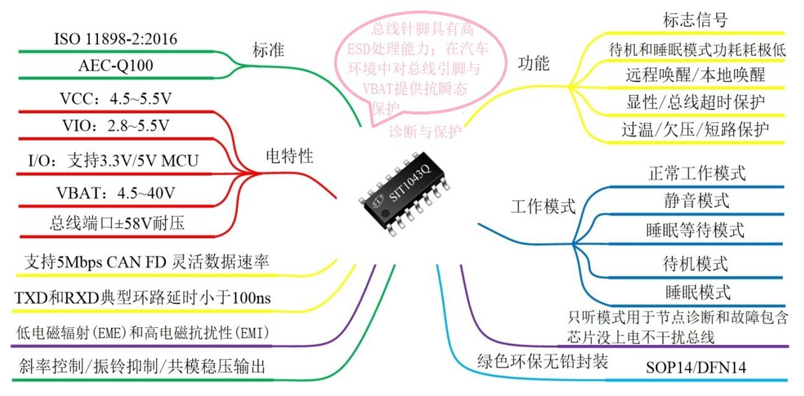 遠程喚醒:喚醒源來源于自身ECU節(jié)點所在的網(wǎng)絡(luò)報文,該節(jié)點可以處于完全睡眠狀態(tài),一般無能量消耗。這種喚醒的特點:只有當CAN收發(fā)器監(jiān)控到總線電平變化或者特定報文時,就會接通CAN芯片INH引腳控制LDO給到主控芯片上電,從而喚醒ECU節(jié)點。芯力特公司的SIT1043Q CAN收發(fā)器兼容以上兩種喚醒功能,下面我們來對SIT1043Q做個簡單的介紹。