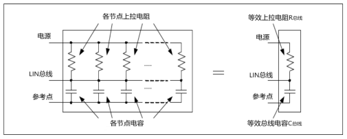 RC時間常數(shù)中R為總線上所有節(jié)點上拉電阻并聯(lián)的總阻值R總線,C為總線上所有的主從節(jié)點并聯(lián)電容及總的線電容之和即C總線 ,這個值限定在(1~10nF);如下: