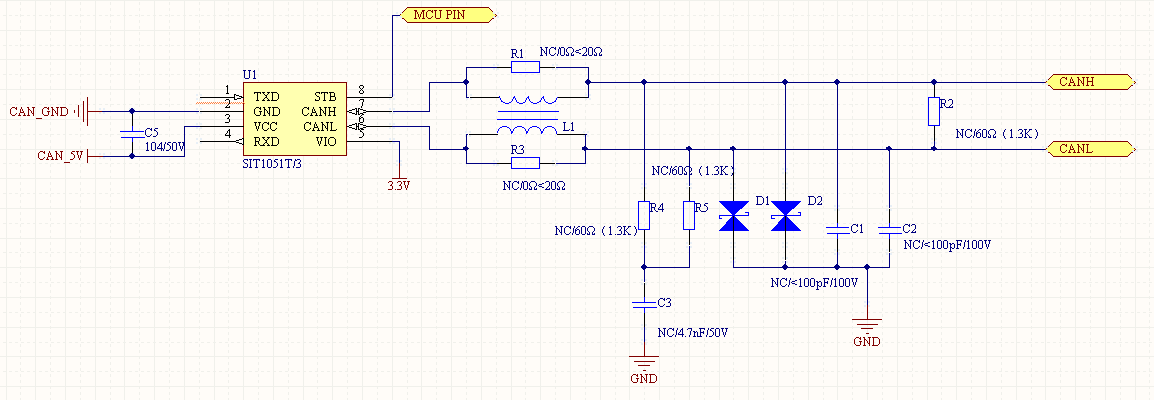 CANH 和 CANL 輸出到 GND 的一對(duì)匹配電容用于提高抗電磁干擾的性能。相應(yīng)噪聲源的阻抗和 CANH 和 CANL 對(duì)地的電容組成了一個(gè) RC 低通濾波器。電容值必須由節(jié)點(diǎn)的數(shù)量和數(shù)據(jù)傳輸頻率決定。一般選取<100pF,如果外接 ESD 保護(hù)器件,該電容值可適當(dāng)減小或省掉。圖中串聯(lián)電阻可調(diào)整與對(duì)地電容形成的低通濾波器性能,但電阻值不應(yīng)過大,導(dǎo)致顯性差分電壓值降低明顯。